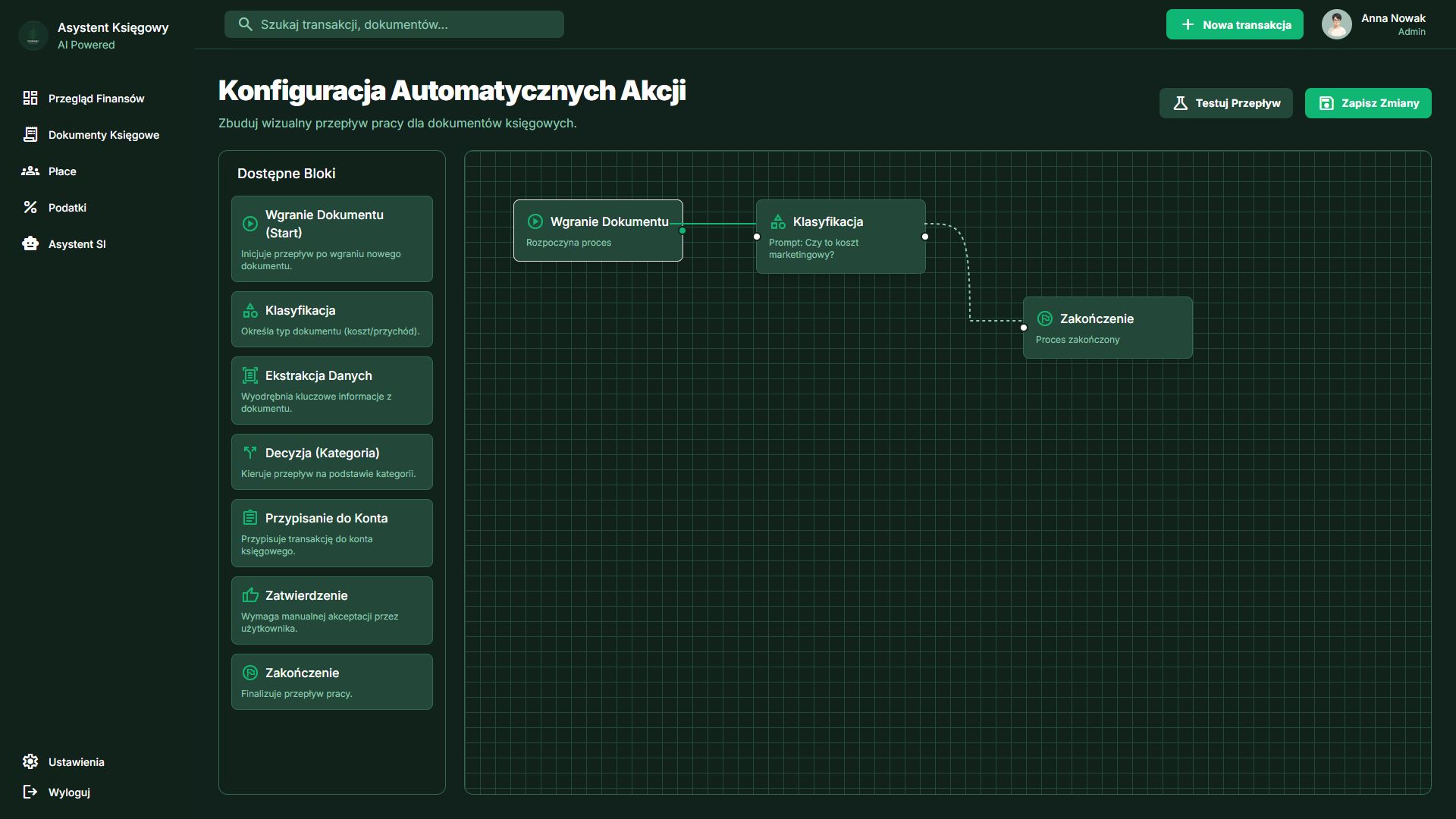 Uzupełnieniem systemu jest wizualny flow builder, który pozwala budować automatyczne scenariusze obsługi dokumentów: od OCR, przez klasyfikację dokumentów, po generowanie propozycji księgowań i wysyłkę dokumentów do akceptacji. Dzięki temu księgowi mogą dostosować logikę systemu do potrzeb obsługiwanych firm, własnego stylu pracy, oraz ciągle zmieniających się przepisów bez konieczności ingerencji programistycznej.