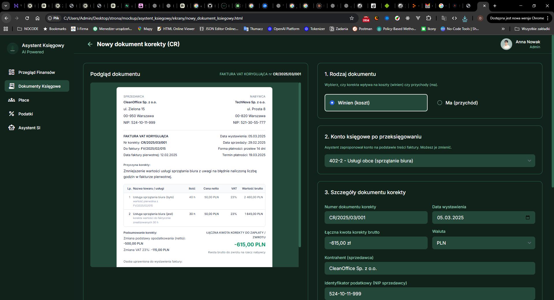 Szczególne znaczenie ma moduł dokumentów, który pełni rolę centrum prac księgowych. System automatycznie odczytuje treść faktur, porównuje je z historią dokumentów i przepływami z wyciągów bankowych a następnie samodzielnie proponuje odpowiednie księgowania, rozpoznaje duplikaty oraz pomaga identyfikować braki w dokumentacji. Dzięki temu każdy dokument ma swój przebieg, status i komplet danych w jednym miejscu, a księgowy może reagować szybciej i bardziej precyzyjnie.