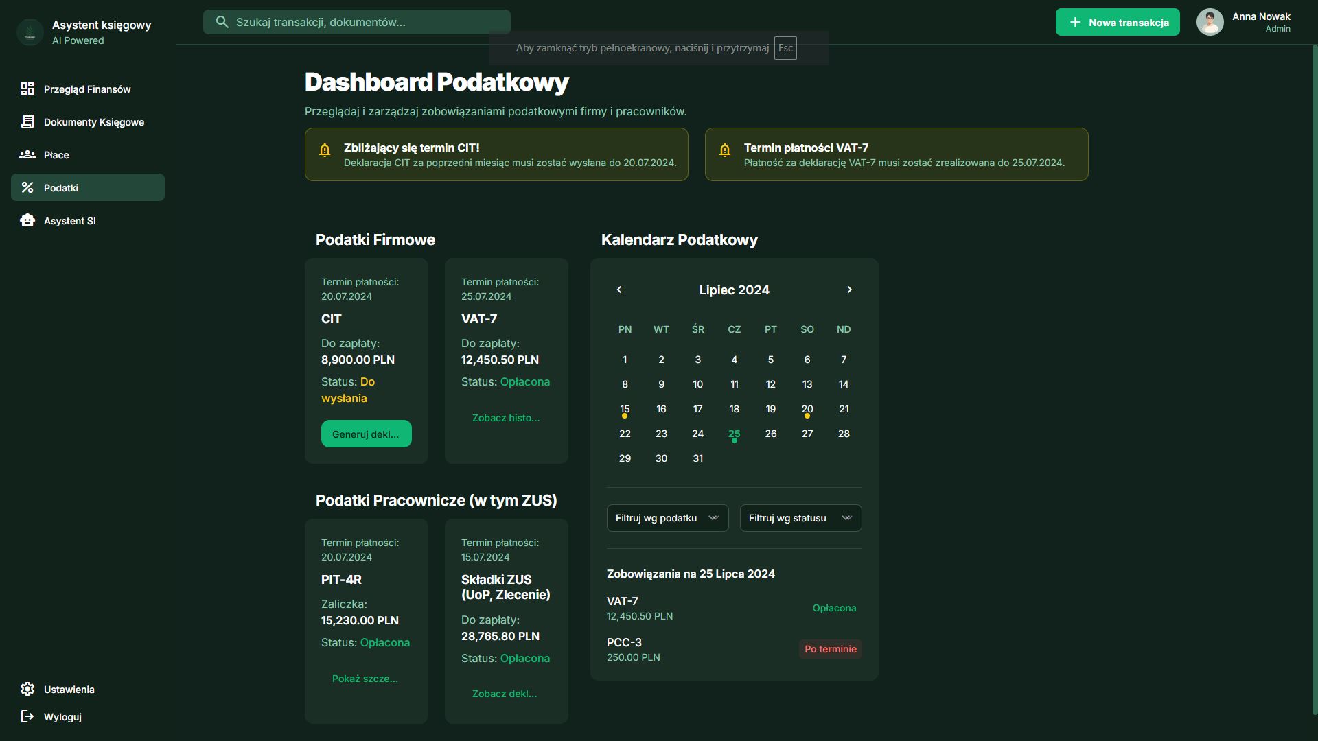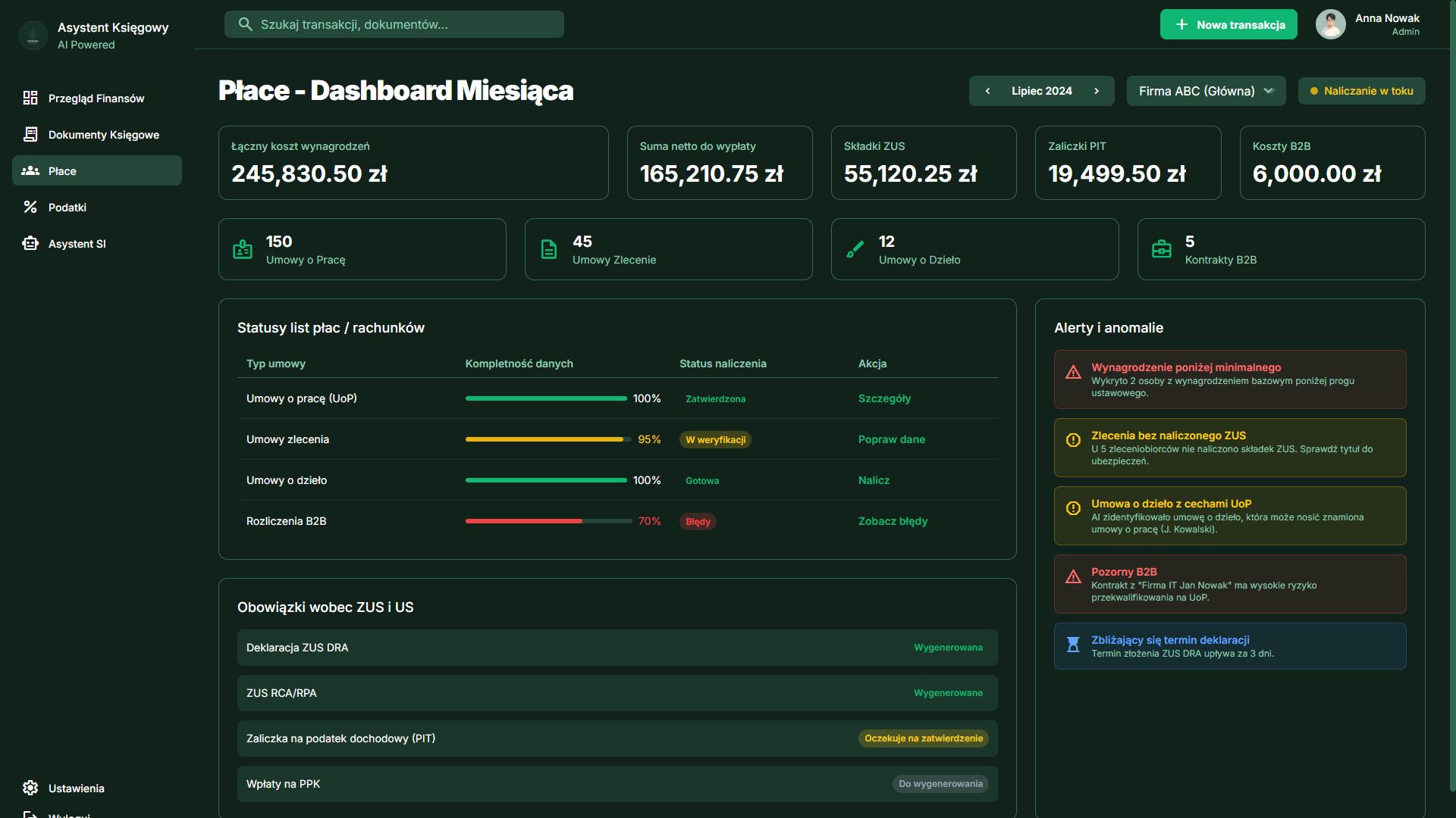 Moduł płacowy dostarcza comiesięcznego widoku kosztów wynagrodzeń, ZUS, PIT oraz statusów naliczeń dla różnych jednostek i projektów. Pozwala analizować anomalia w danych, tworzyć podsumowania i szybko identyfikować elementy wymagające uwagi. Z kolei dashboard podatkowy gromadzi wszystkie zobowiązania CIT, VAT, PIT i ZUS w jednej przestrzeni, dając księgowym automatyczne alerty i aktualny kalendarz powiązany z realnymi kwotami.