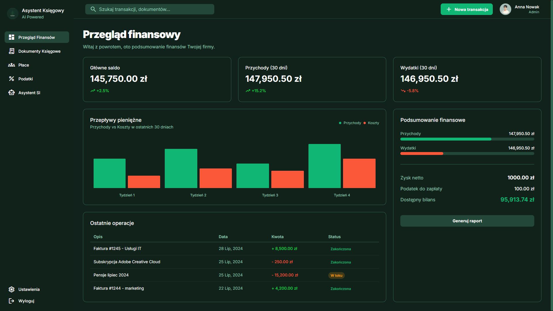 W odpowiedzi na te potrzeby powstał rozbudowany, modułowy ekosystem AI, który łączy dane z systemu księgowego, dokumenty, płace i podatki w jeden spójny kokpit operacyjny. System integruje się bezpośrednio z ERP, dzięki czemu wszystkie decyzje i przeliczenia są oparte na aktualnych danych księgowych i rozrachunkach. Każdy moduł, od dokumentów, przez płace, aż po podatki, został zaprojektowany tak, by prezentować informacje w przejrzystej formie, a także umożliwiać szybkie przejście od podglądu danych do realnej akcji.
