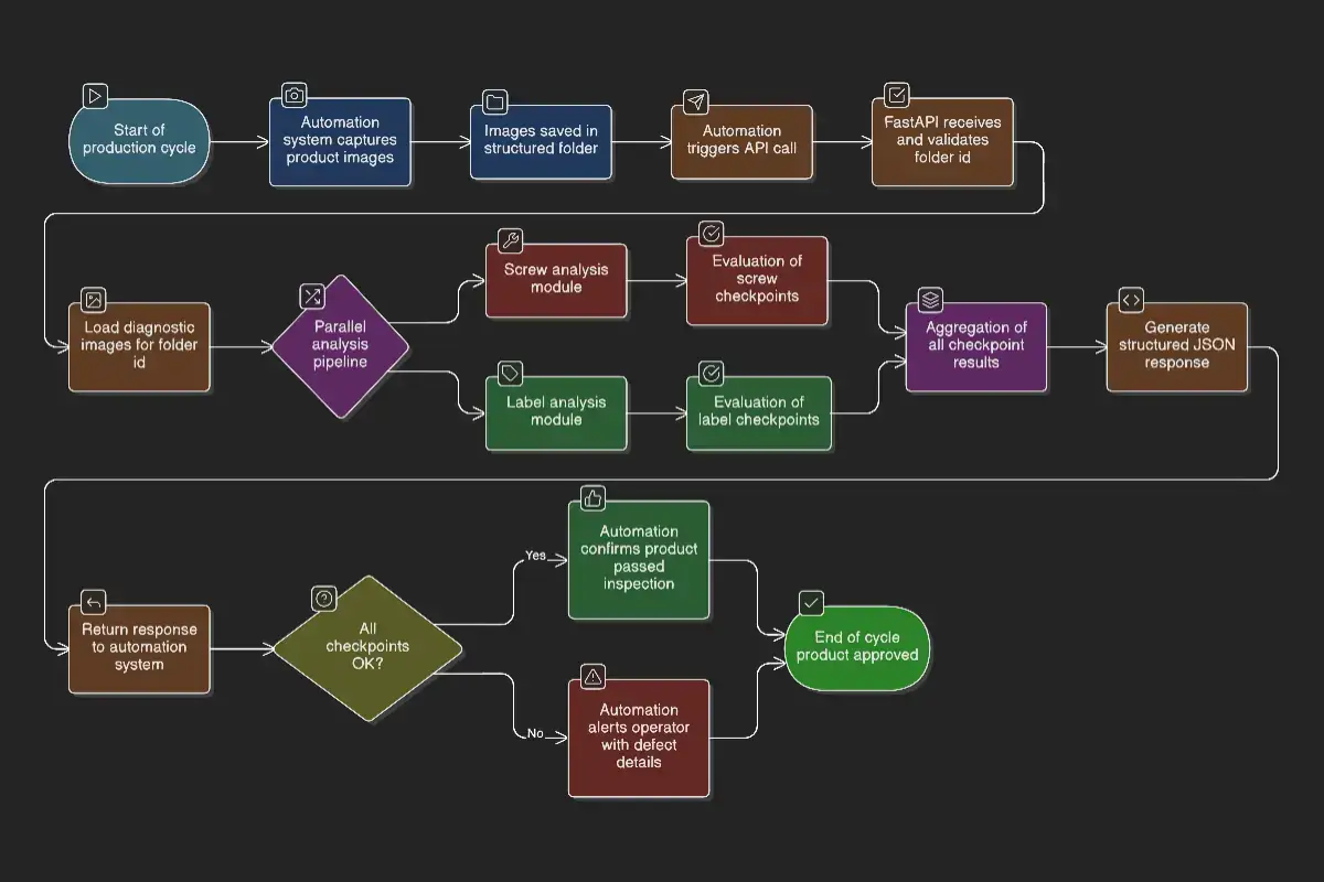Opracowany system oceniał łącznie 12 kluczowych punktów kontrolnych, przypisanych do elementów mechanicznych oraz etykiet. Po zakończeniu analizy moduły agregowały wyniki i generowały ustrukturyzowaną odpowiedź dla automatyki klienta — każda kontrolowana cecha otrzymywała swój status „OK” lub „Defekt”, wraz z dodatkowym komunikatem opisowym.